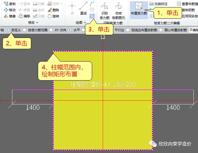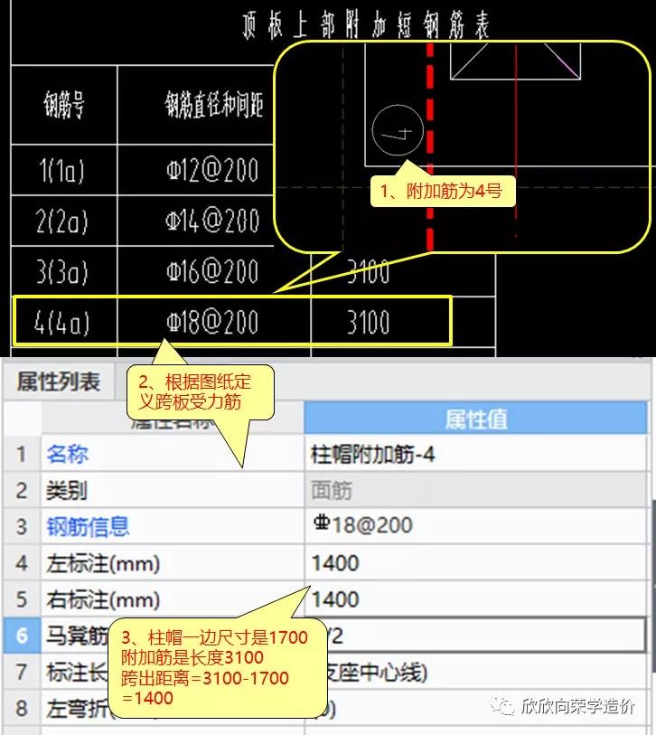 然后根据图纸的表格就可以定义跨板受力筋了,附加筋跨出板的距离,通过表格给出的长度,减去柱帽的长度,可以计算出来,如图14所示。